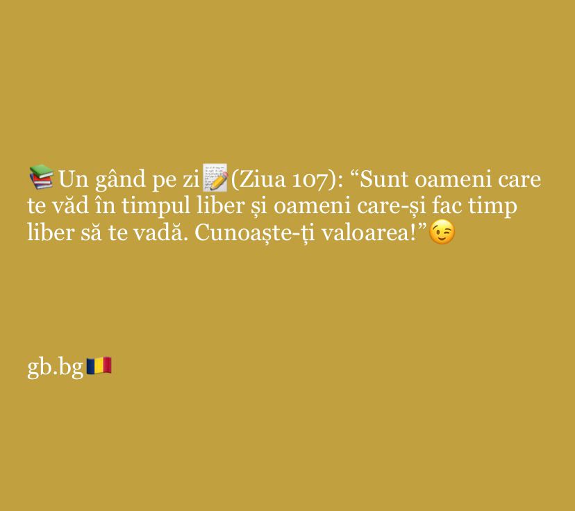 Ziua 107ianuarie 16, 2025 1 min read „Sunt oameni care te văd în timpul liber și oameni care-și fac timp liber să te vadă. Cunoaște-ți valoarea! „