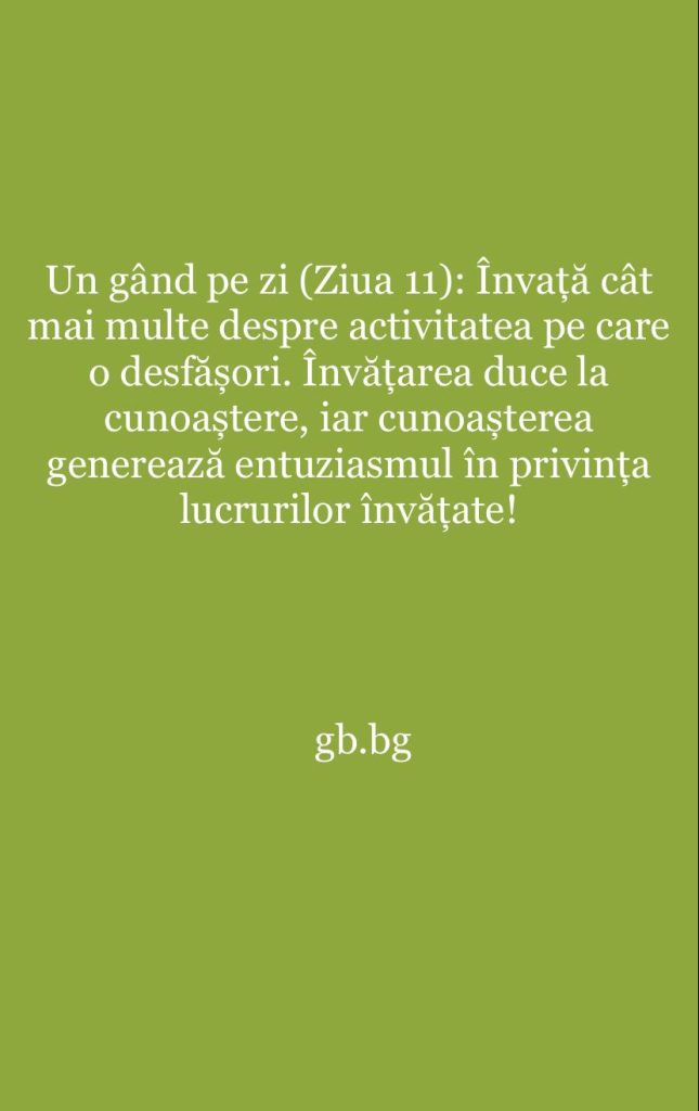 „Învață cât mai multe despre activitatea pe care o desfășori. Învățarea duce la cunoaștere, iar cunoașterea generează entuziasmul în privinșa lucrurilor învățate.”