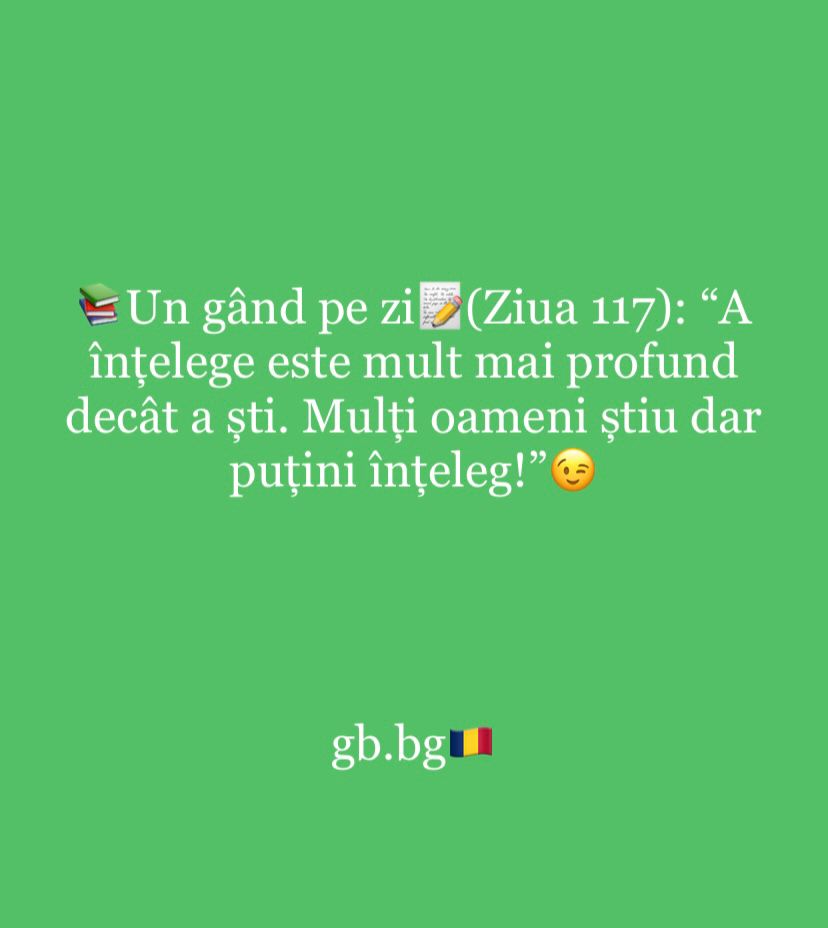 Ziua 117ianuarie 16, 2025 1 min read „A înțelege este mult mai profund decât a ști. Mulți oameni știu dar puțini înțeleg!”
