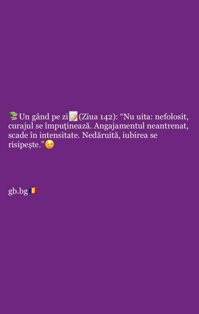 „Nu uita: nefolosit, curajul se împuținează. Angajamentul neantrenat, scade în intensitate. Nedăruită, iubirea se risipește”
