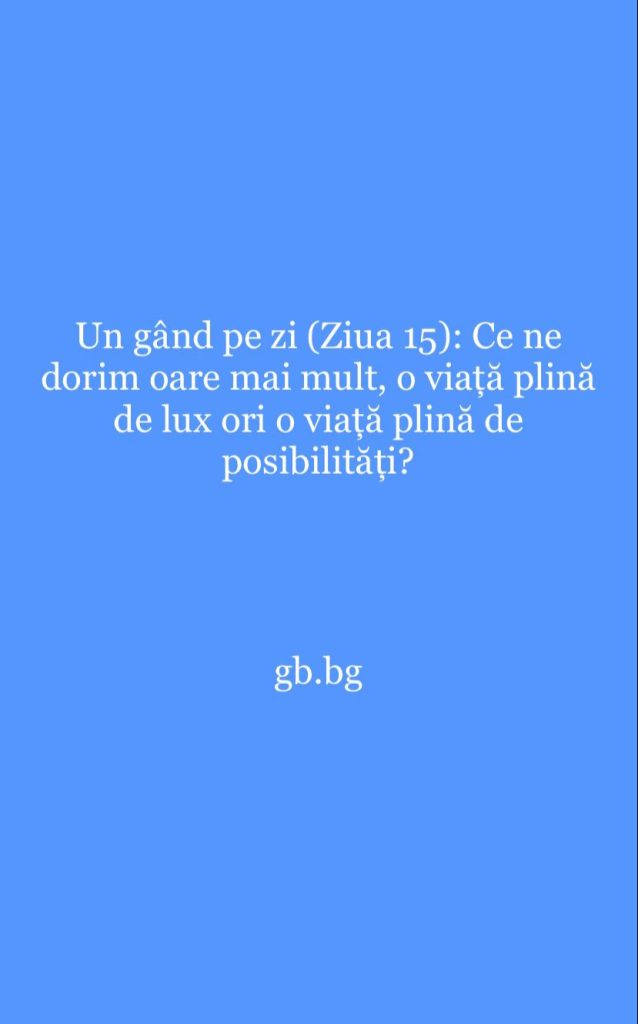 Ziua 15ianuarie 7, 2025 1 min read „Ce ne dorim oare mai mult, o viață plină de lux ori o viață plină de posibilități?”