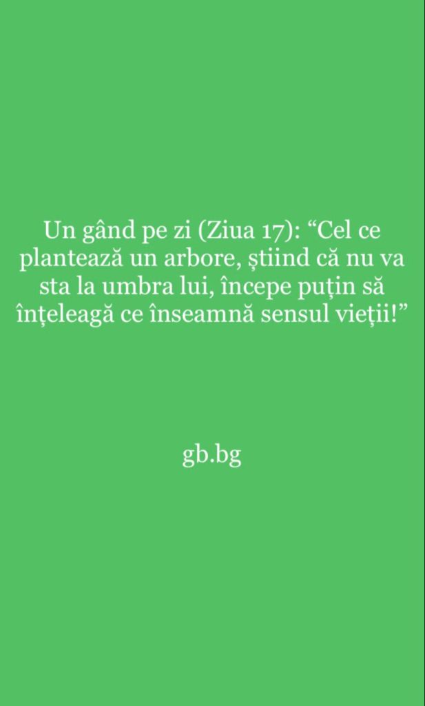 Ziua 17ianuarie 7, 2025 1 min read „Cel ce plantează un arbore, știind că nu va sta la umbra lui, începe puțin să înțeleagă ce înseamnă sensul vieții!”