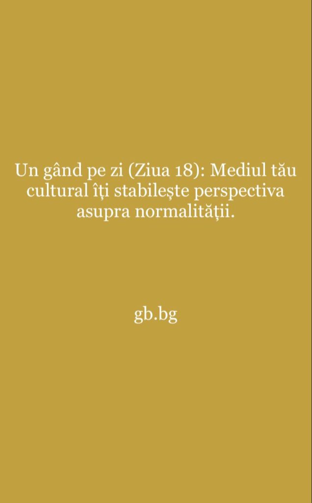 Ziua 18ianuarie 7, 2025 1 min read „Mediul tău cultural îți stabilește perspectiva asupra normalității.”