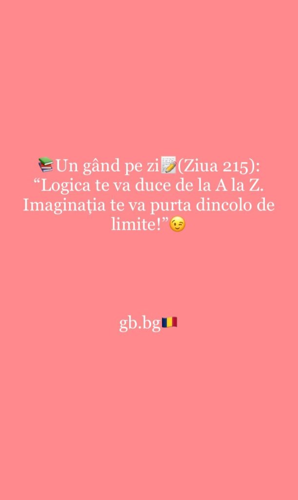 Ziua 215aprilie 28, 2025 1 min read „Logica te va duce de la A la Z. Imaginația te va purta dincolo de limite!”