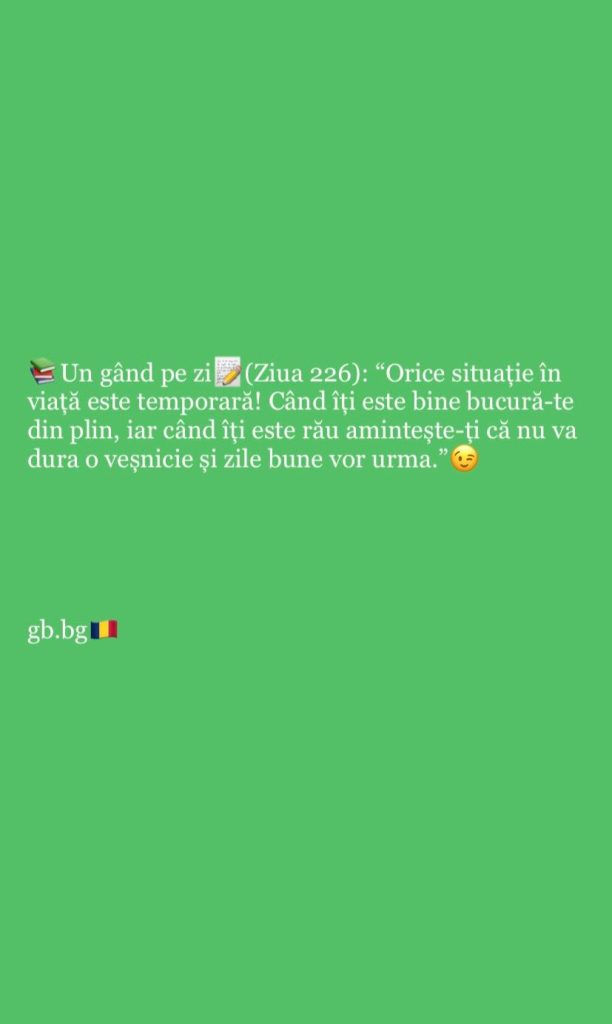„Orice situație în viață este temporară! Când îți este bine bucură-te din plin, iar când îți este rău amintește-ți că nu va dura o veșnicie și zile bune vor urma.”
