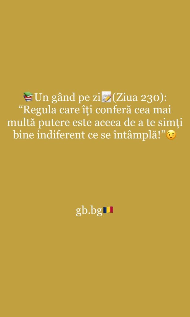 Ziua 230mai 6, 2025 1 min read „regula care îți conferă cea mai multă putere este aceea de a te simți bine indiferent ce se întâmplă!”