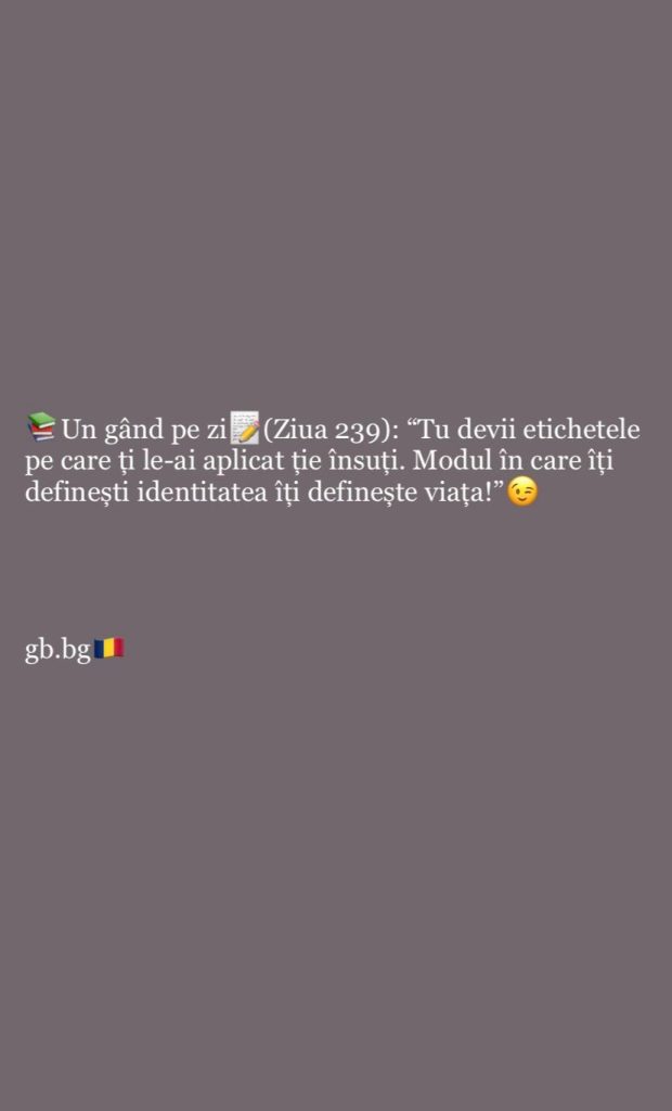 Ziua 239mai 25, 2025 1 min read „Tu devii etichetele pe care ți le-ai aplicat ție însuți. Modul în care îți definești identitatea îți definește viața!”