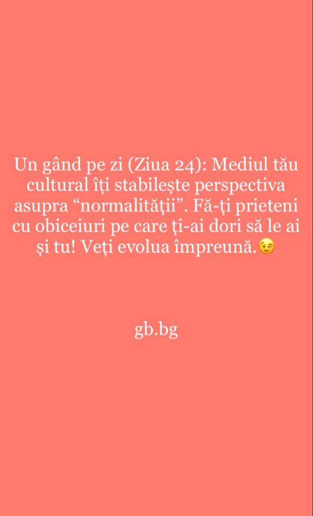 „Mediul tău cultural îți stabilește perspectiva asupra <normalității>. Fă-ți prieteni cu obiceiuri pe care ți-ai dori să le ai și tu! Veți evolua împreună.”