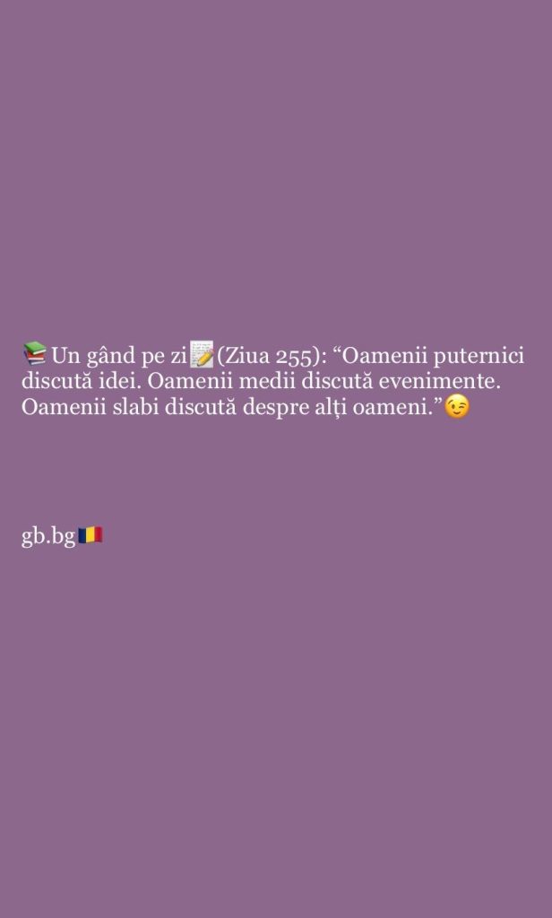 Ziua 255iunie 5, 2025 1 min read „Oamenii puternici discută idei. Oamenii medii discută evenimente. Oamenii slabi discută despre alți oameni.”