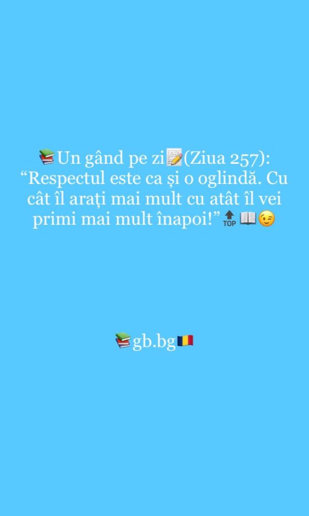 Ziua 257iunie 29, 2025 1 min read „Respectul este ca și o oglindă. Cu cât îl arăți mai mult cu atât îl vei primi mai mult înapoi!”