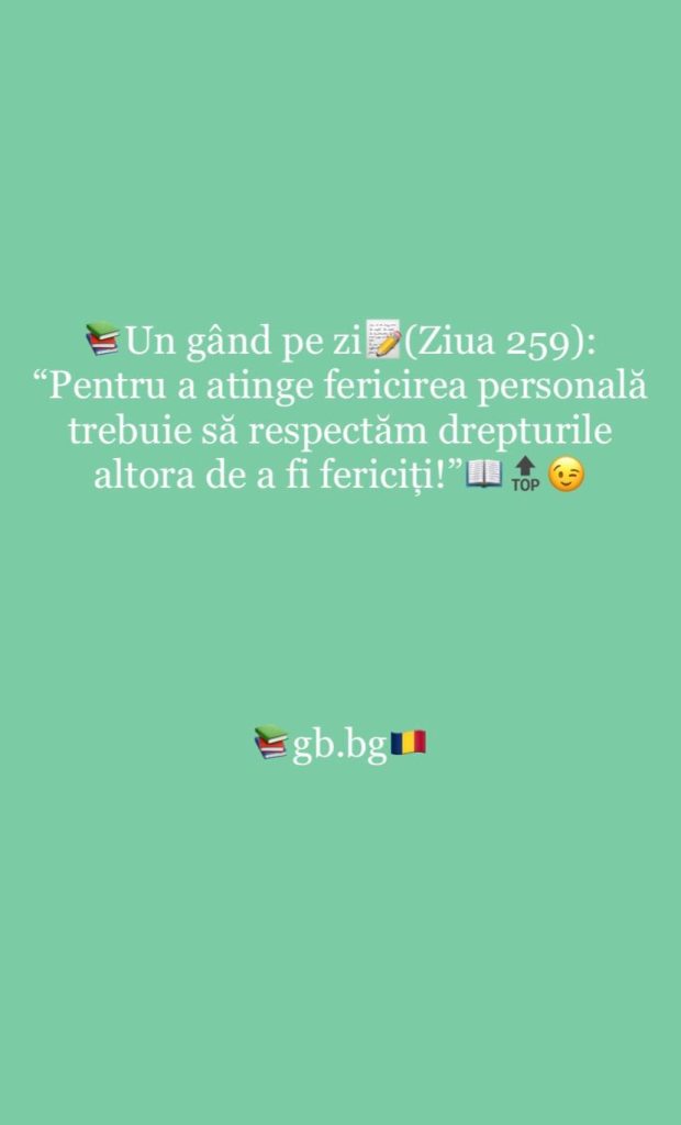 Ziua 259iunie 29, 2025 1 min read „Pentru a atinge fericirea personală trebuie să respectăm drepturile altora de a fi fericiți!”