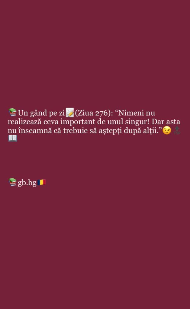 Ziua 276august 21, 2025 1 min read „Nimeni nu realizează ceva important de unul singur! Dar asta nu înseamnă că trebuie să aștepți după alții.”