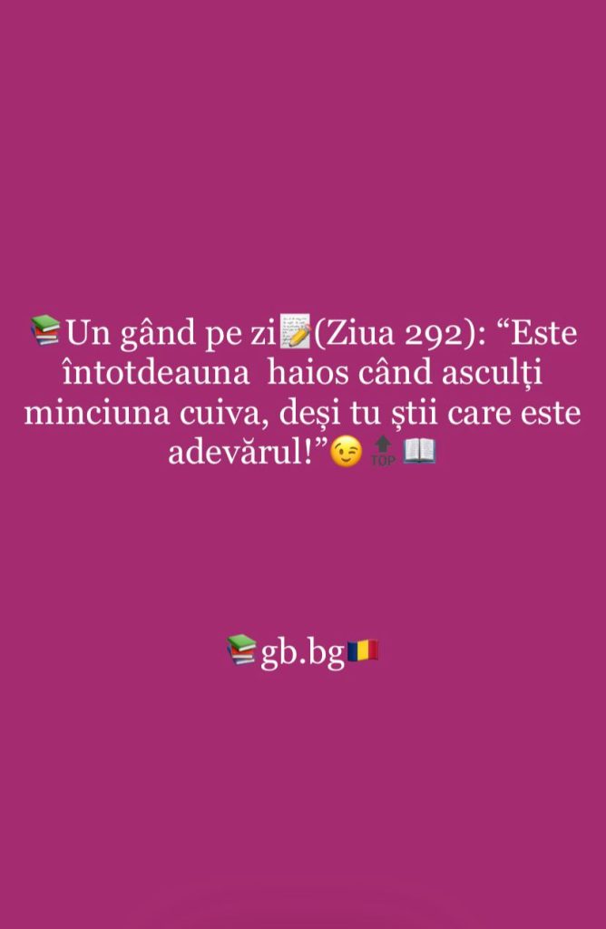 Ziua 292august 21, 2025 1 min read „Este întotdeauna haios când asculți minciuna cuiva, deși tu știi care este adevărul!”