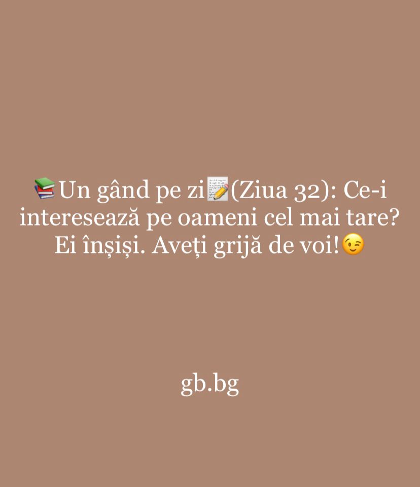 Ziua 32ianuarie 8, 2025 1 min read Ce-i interesează pe oameni cel mai tare? Ei înșiși. Aveți grijă de voi!