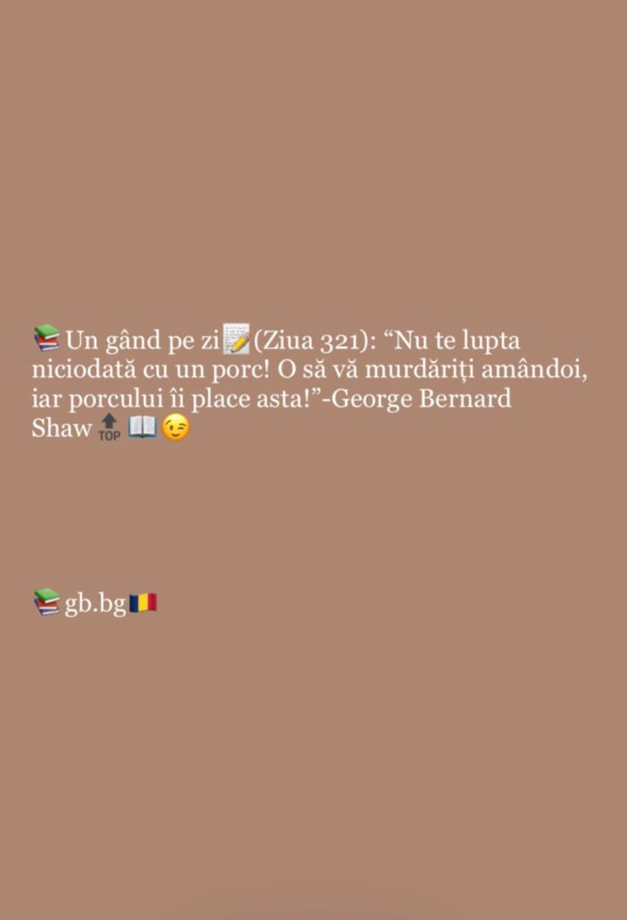 Ziua 321septembrie 28, 2025 1 min read „Nu te lupta niciodată cu un porc! O să vă murdăriți amândoi, iar porcului îi place asta!”-George Bernard Shaw