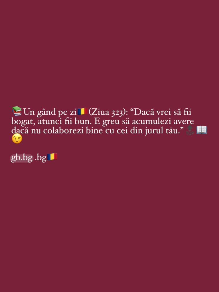 Ziua 323septembrie 28, 2025 1 min read „Dacă vrei să fii bogat, atunci fii bun. E greu să acumulezi avere dacă nu colaborezi bine cu cei din jurul tău!”