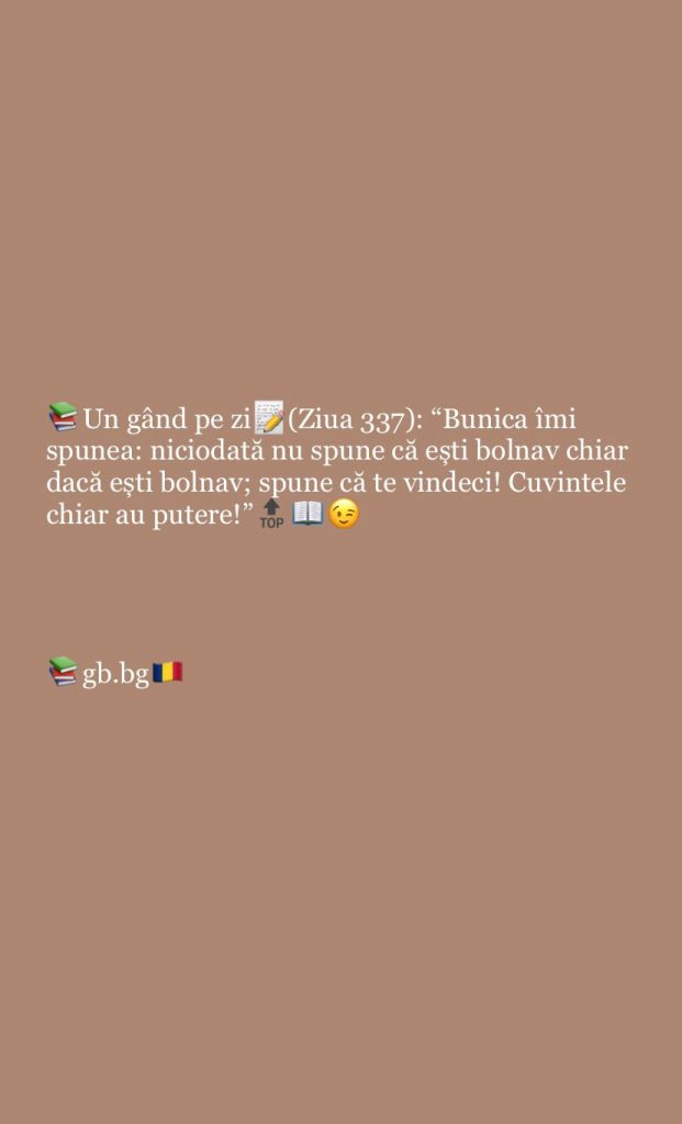 „Bunica îmi spunea: niciodată nu spune că ești bolnav chiar dacă ești bolnav; spune că te vindeci! Cuvintele chiar au putere!”