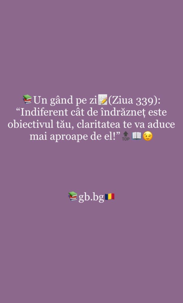 Ziua 339decembrie 9, 2025 1 min read „Indiferent cât de îndrăzneț este obiectivul tău, claritatea te va aduce mai aproape de el!”