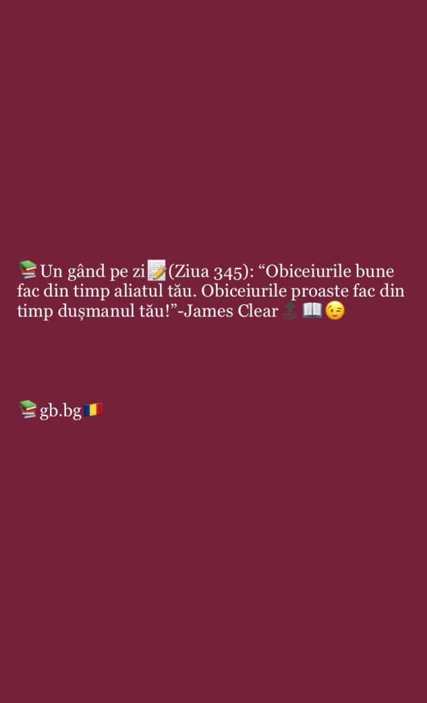 Ziua 345decembrie 9, 2025 1 min read „Obiceiurile bune fac din timp aliatul tău. Obiceiurile proaste fac din timp dușmanul tău!”-James Clear