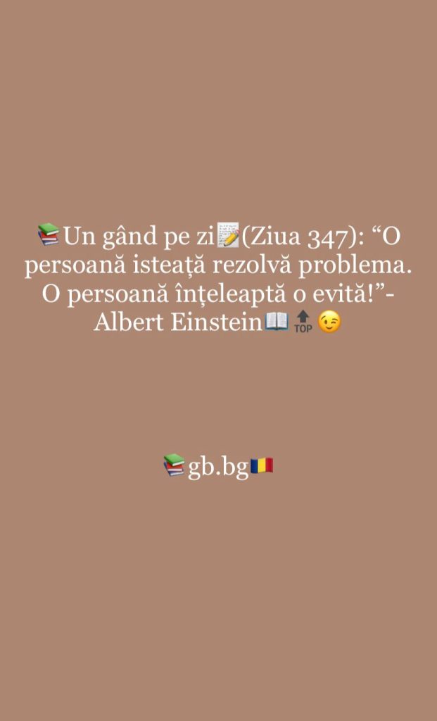 Ziua 347decembrie 9, 2025 1 min read „O persoană isteață rezolvă problema. O persoană înțeleaptă o evită!”-Albert Einstein