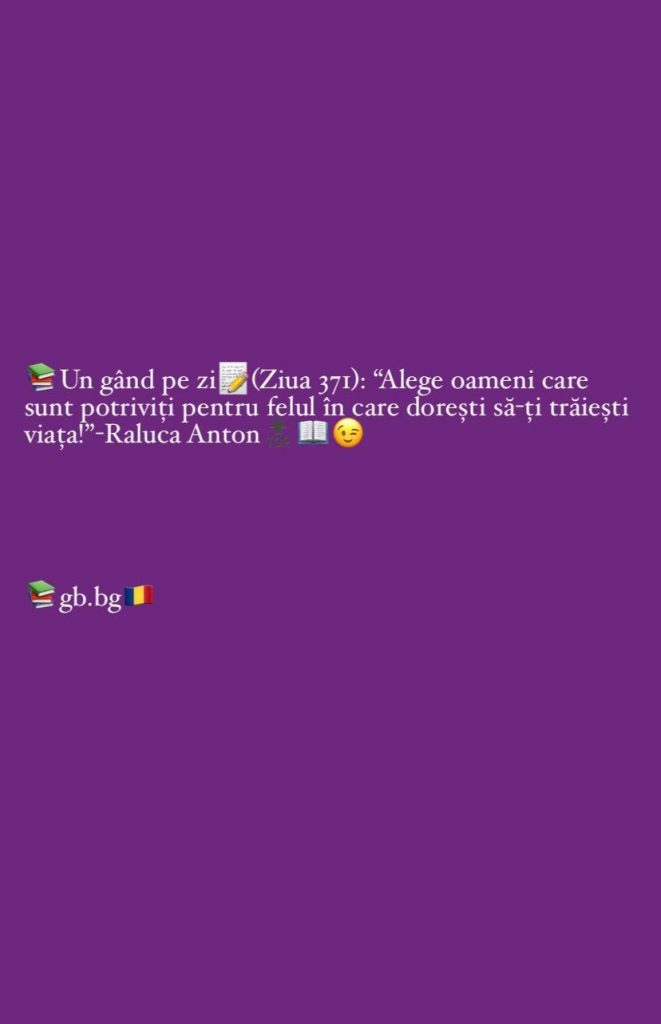 Ziua 371decembrie 9, 2025 1 min read „Alege oameni care sunt potriviți pentru felul în care dorești să-ți trăiești viața!”-Raluca Anton