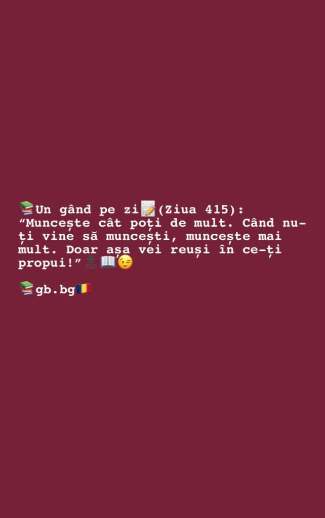Ziua 415aprilie 1, 2026 1 min read „Muncește cât poți de mult. Când nu-ți vine să muncești, muncește mai mult. Doar așa vei reuși în ce-ți propui!”