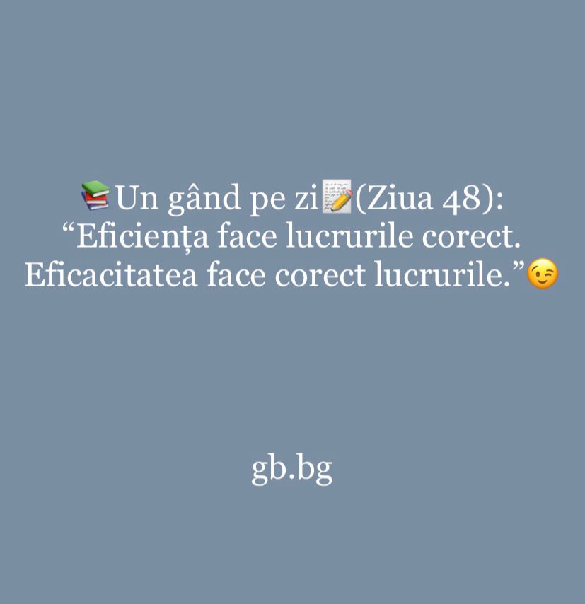 Ziua 48ianuarie 8, 2025 1 min read „Eficiența face lucrurile corect. Eficacitatea face corect lucrurile.”