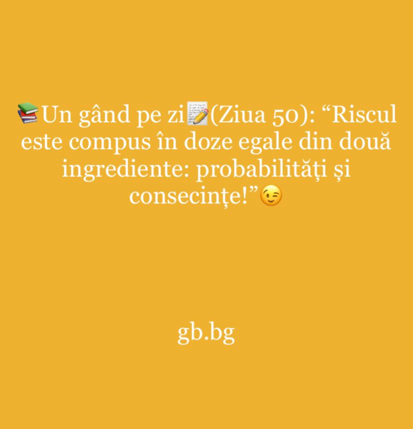 Ziua 50ianuarie 8, 2025 1 min read „Riscul este compus în doze egale din două ingrediente: probabilități și consecințe!”
