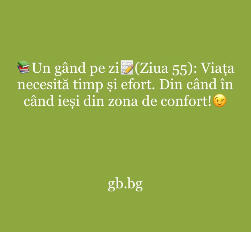 Ziua 55ianuarie 8, 2025 1 min read „Viața necesită timp și efort. Din când în când ieși din zona de confort! „