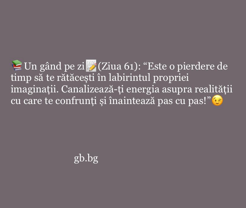 „Este o pierdere de timp să te rătăcești în labirintul propriei imaginații. Canalizează-ți energia asupra realității cu care te confrunți și înaintează pas cu pas!”