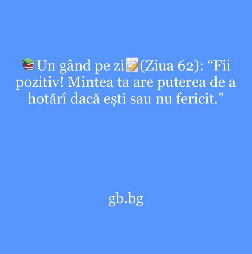 Ziua 62ianuarie 13, 2025 1 min read „Fii pozitiv! Mintea ta are puterea de a hotărî dacă ești sau nu fericit.”