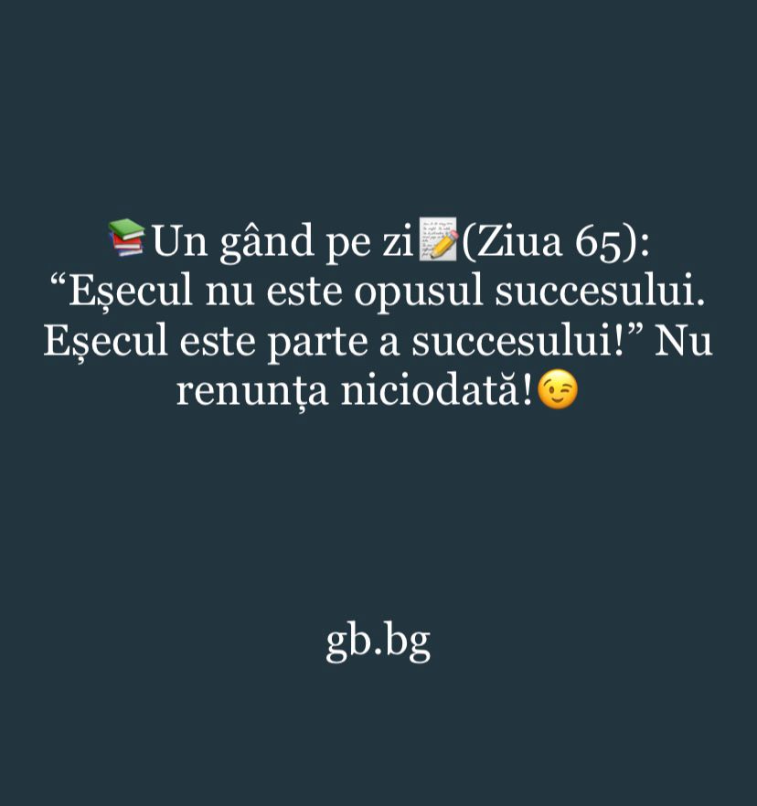 Ziua 65ianuarie 13, 2025 1 min read „Eșecul nu este opusul succesului. Eșecul este parte a succesului! Nu renunța niciodată!”