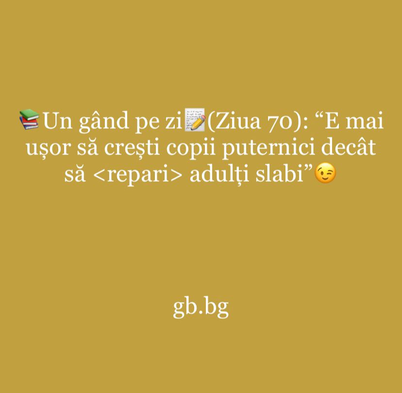 Ziua 70ianuarie 13, 2025 1 min read „E mai ușor să crești copii puternici decât să <repari> adulți slabi.”