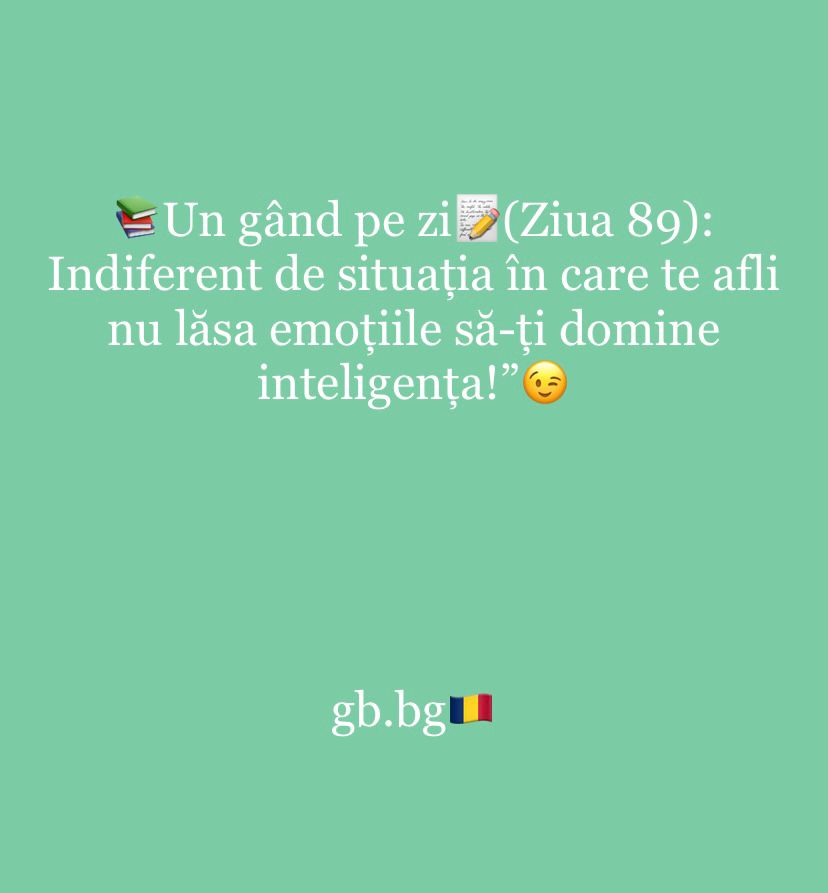 Ziua 89ianuarie 13, 2025 1 min read „Indiferent de situația în care te afli nu lăsa emoțiile să-ți domine inteligența!”