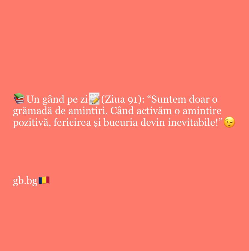 Ziua 91ianuarie 13, 2025 1 min read „Suntem doar o grămadă de amintiri. Când activăm o amintire pozitivă, fericirea și bucuria devin inevitabile!”